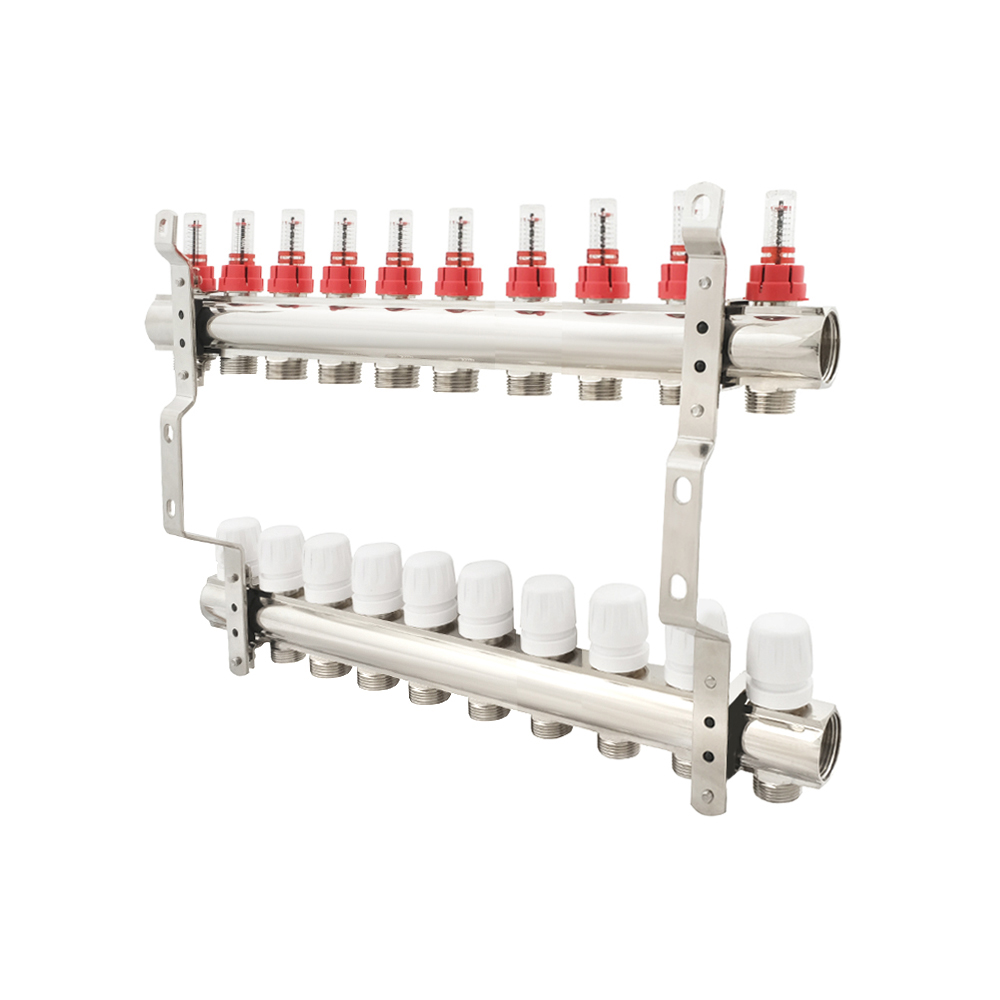 колектор лінії подачі і зворотний колектор, регулювальні вентилі з вбудованими витратомірами, термостатичні вентилі з можливістю установки сервоприводу. Витратоміри можна виконати налаштування від 0 до 5 л/хв. Кожне відведення зворотного колектора обладнано термостатичним вентилем для
