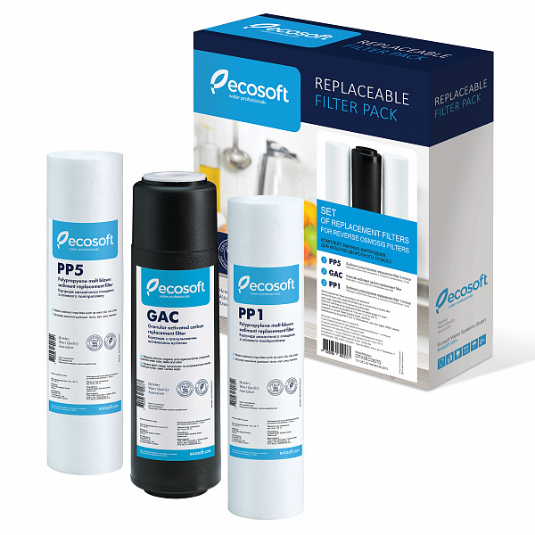 Комплект картриджів Ecosoft 'CPV3ECOSTD' для фільтрів зворотного осмосу. У комплект входять три картриджі Ecosoft, необхідні для підготовки води перед мембранним елементом в домашньому фільтрі з технологією зворотного осмосу. Вся сантехніка має сертифікати якості та санітарно-гігієнічні висновки.