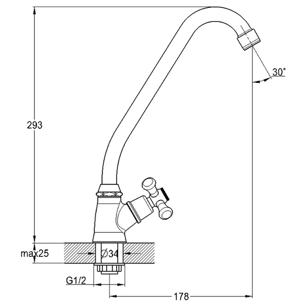 Монозмішувач G-Lauf QTZ14-A827 використовується для умивальника/мийки, має поворотний вигнутий вилив (гусак) 180мм, одноважільне управління, механічну вентильну головку і хрестоподібний маховик, стриманий дизайн.