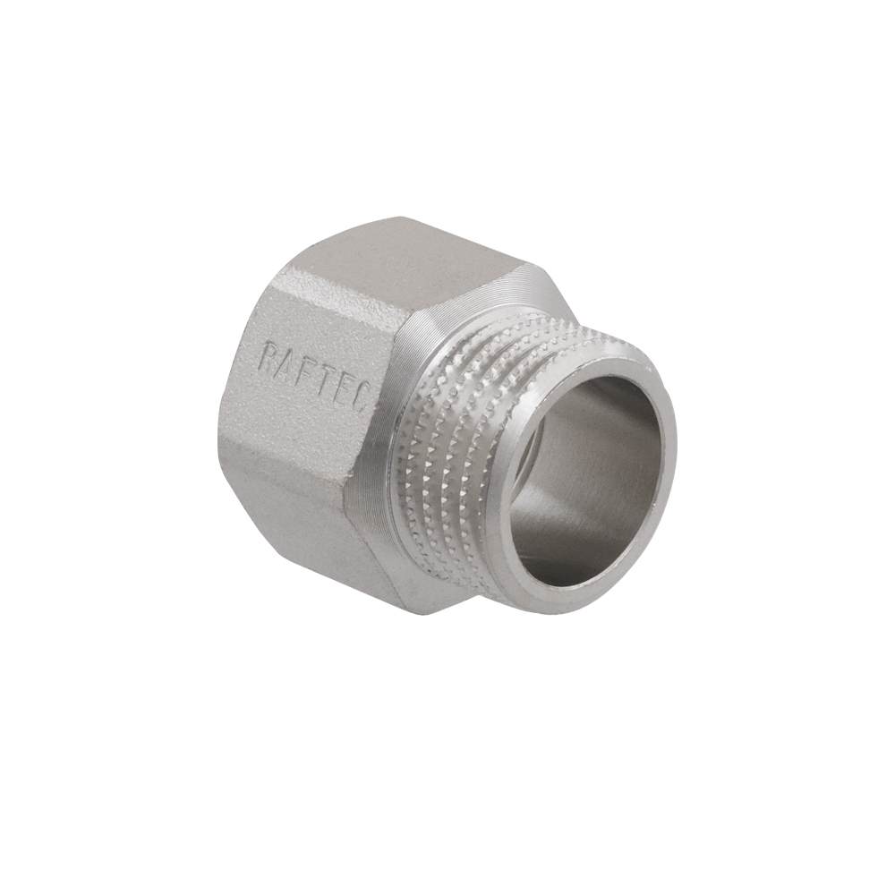 Різьбовий фітинг Raftec - латунний нікельований фітинг для подовження з'єднань. Різьба рівнопрохідна внутрішня-зовнішня, циліндрична трубна ISO 228, EN 10226. Корпус шестигранної форми, під гайковий ключ.