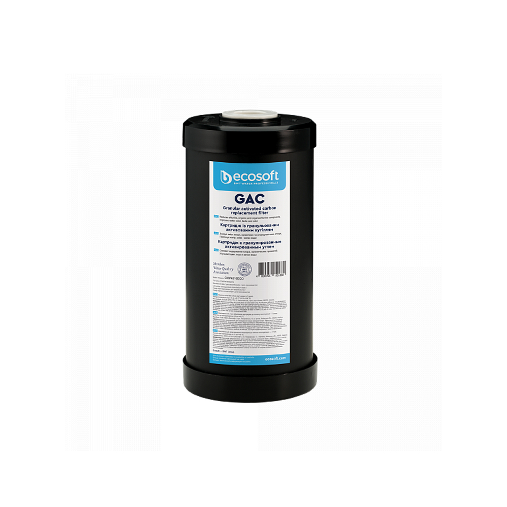 Картридж Ecosoft 'CHV4510ECOEXP' c гранулированным углем. Картридж угольный Ecosoft CHV4510ECOEXP эффективно очищает воду от хлора и его последствий: неприятного резкого запаха и горьковатого привкуса, удаляет органические соединения. Гранулированная, рассыпчатая структура картриджа обеспечивает максимальный контакт воды с фильтрующей загрузкой и не снижает давление. Вся сантехника имеет сертификаты качества и санитарно-гигиенические заключения.