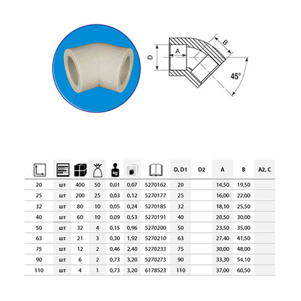 Колено полипропиленовое с углом изгиба 45 градусов 110 мм ASG- полипропиленовые фитинги, предназначенные для пайки труб ППР и соединения их с резьбовыми фитингами либо запорной арматурой. Вся сантехника имеет сертификаты качества и санитарно-гигиенические заключения.
