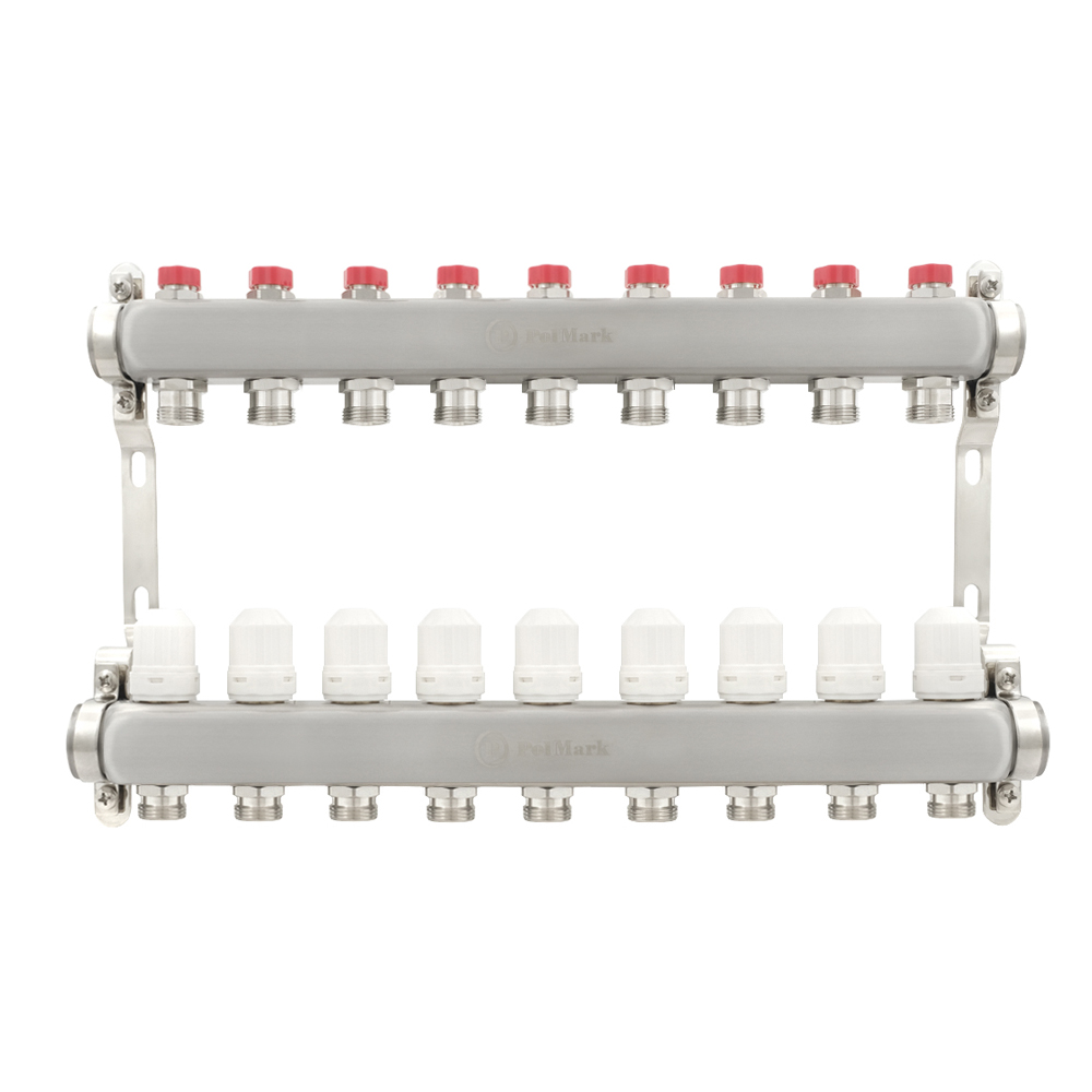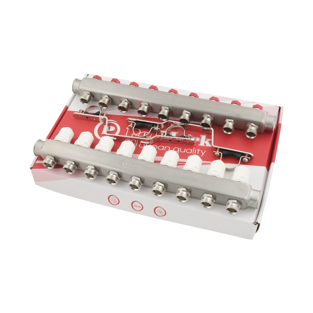 Коллекторы в сборе выпускаются с количеством выходов от 2-х до 12-ти. Присоединение циркуляционных петель осуществляется с помощью фитингов стандарта 'Евроконус' 3/4'.