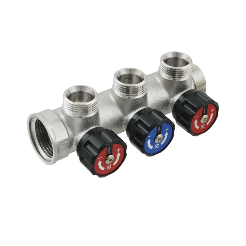 Коллекторы предназначены для равномерного распределения воды от основного трубопровода до конечных точек потребления. Наличие регулирующих вентилей позволяют точно настроить расход каждого потребителя, а при необходимости закрыть поток каждой ветки.