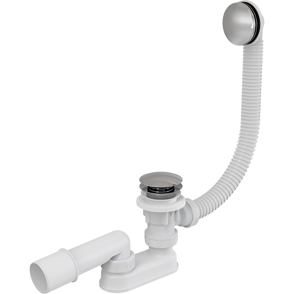 Пластиковий сифон автомат для ванн зі зливом-переливом виготовлений з високоякісного поліпропілену. Поворотна головка - метал з хромованим покриттям, управляє відкриттям і закриттям випуску сифона за допомогою тягового троса. Пробка виготовлена з металевого сплаву з хромованим покриттям.