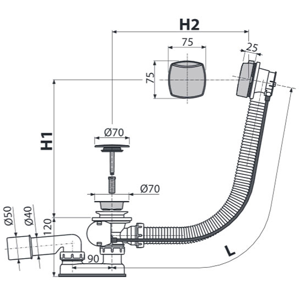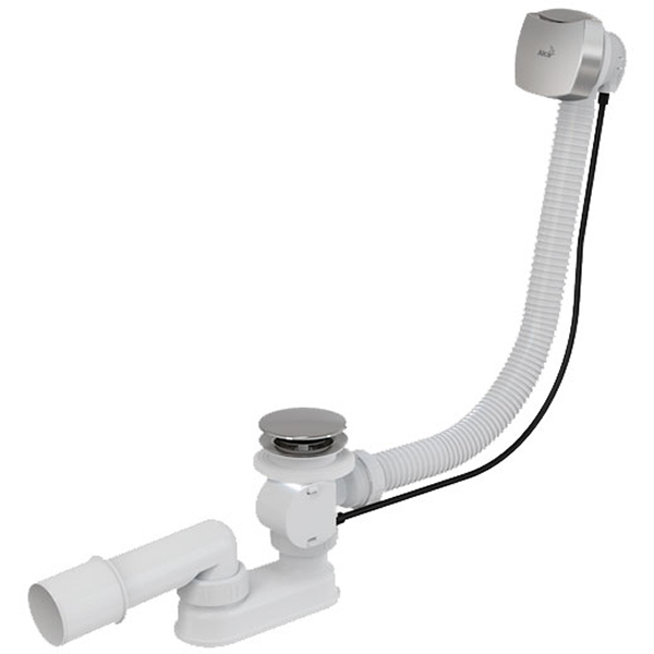 Пластиковий сифон автомат для ванн зі зливом-переливом виготовлений з високоякісного поліпропілену. Поворотна головка - пластик, управляє відкриттям і закриттям випуску сифона за допомогою тягового троса. Пробка виготовлена з металевого сплаву з хромованим покриттям.