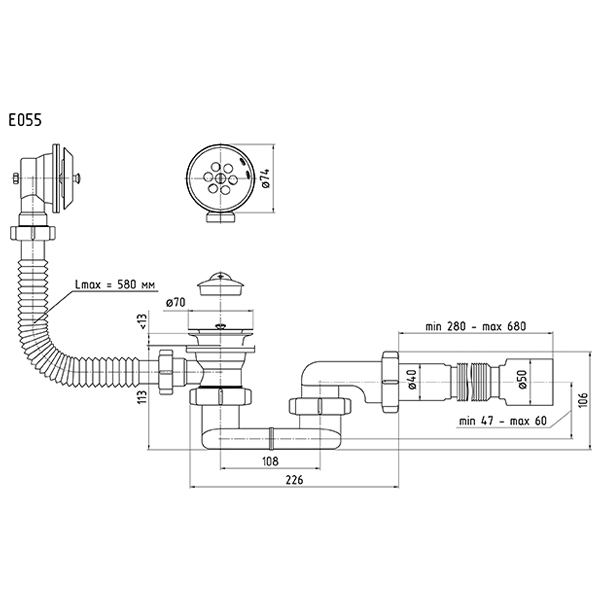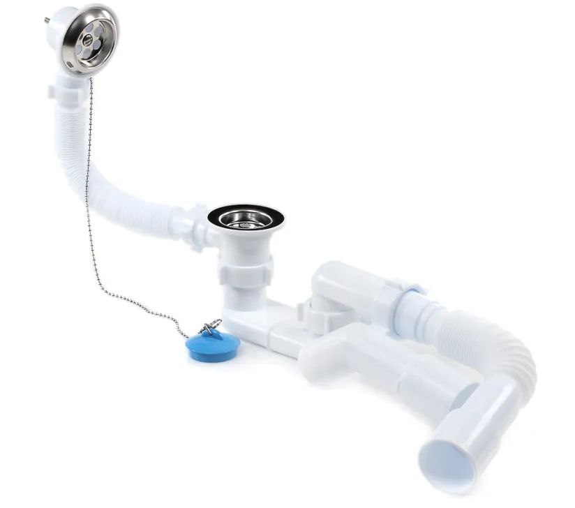Сифон для ванни Ані-Пласт Е 056 1 1/2'х40 (розбірна горловина) з випуском і переливом з гнучкою трубою 40x50 призначений для установки з будь-якою сантехнічною арматурою. Завдяки наявності гнучкої відвідної труби, сифон дозволяє легко розв'язувати проблему відведення стічних вод в умовах обмеженого простору.