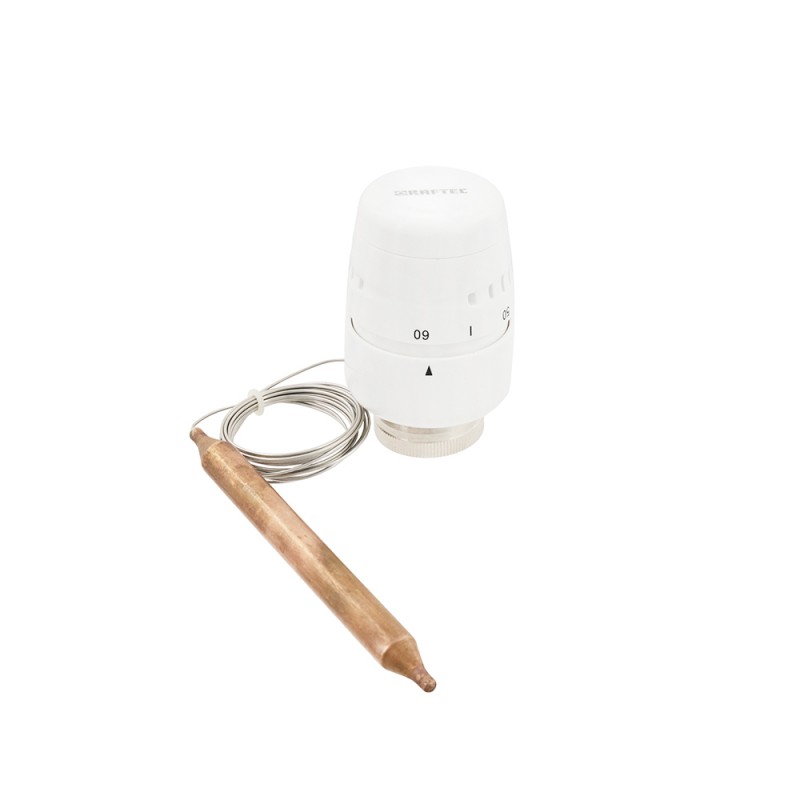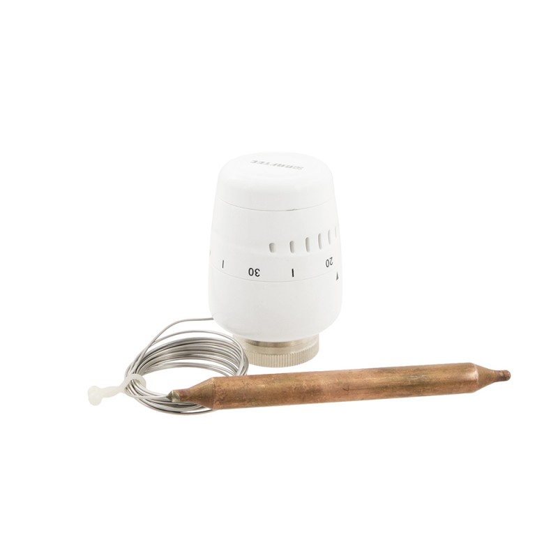 Термостатична головка з виносним погружним датчиком призначена для установки на регулюючий клапан.Чутливий елемент термоголовки з’єднаний із вбудованою капілярною трубкою довжиною 2 м, монтується у гільзу, що підвищує точність підтримки температури. При її зміні головка впливає на шток клапана, керуючи кількістю протікаючого теплоносія.