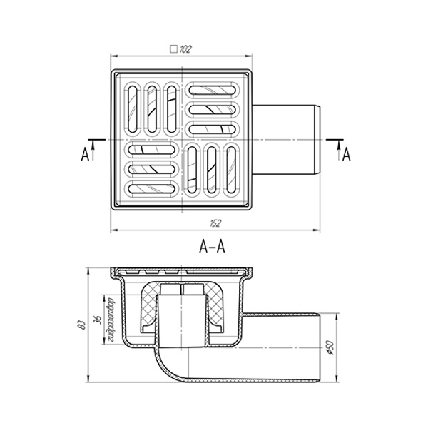 Зливний трап з декоративними гратами з нержавіючої сталі, використовується для відводу води в душових, басейнах, приміщеннях і т.д. Являє собою корпус з високоміцного і стійкого АБС пластика з гідрозатворів і зворотним клапаном, що ефективно запобігає проникненню запахів з каналізації.