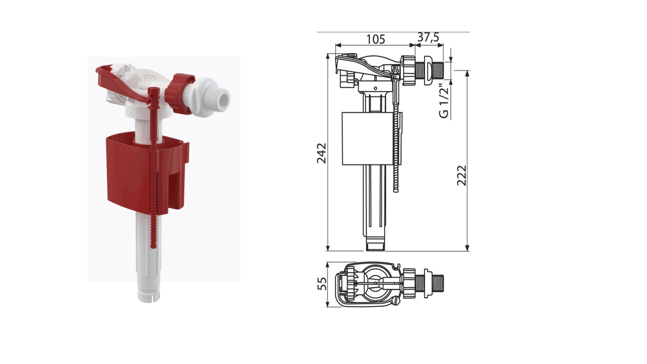 Впускной механізм Alcaplast - клапан впускний для унітазу призначений для подачі і регулювання рівня води в бачку унітаза. Дія впускного клапана для бачка унітазу засноване на гідромеханічних принципі закривання впускного клапана.