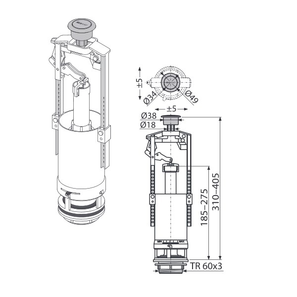Зливний механізм виробництва Alcaplast A2000 обладнаний одинарною START/STOP кнопкою. Економічна витрата води можна налаштувати використовуючи регулювання зливу, яка дозволить виставити необхідні параметри. Завдяки широкому діапазону регулювання по висоті дана модель підходить для змивних бочків різної висоти.
