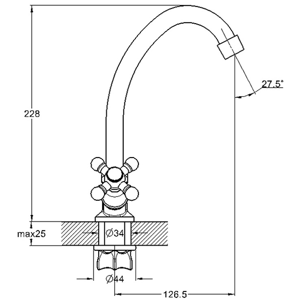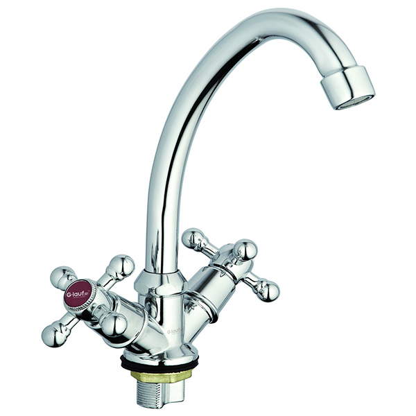 Змішувач марки G-Lauf серії JMX4-A605 використовується для кухонної мийки, має вигнутий поворотний вилив (гусак) 125 мм, аератор для економного використання води, двовентильне управління. Конструкція сантехнічного приладу - 'ялинка'.