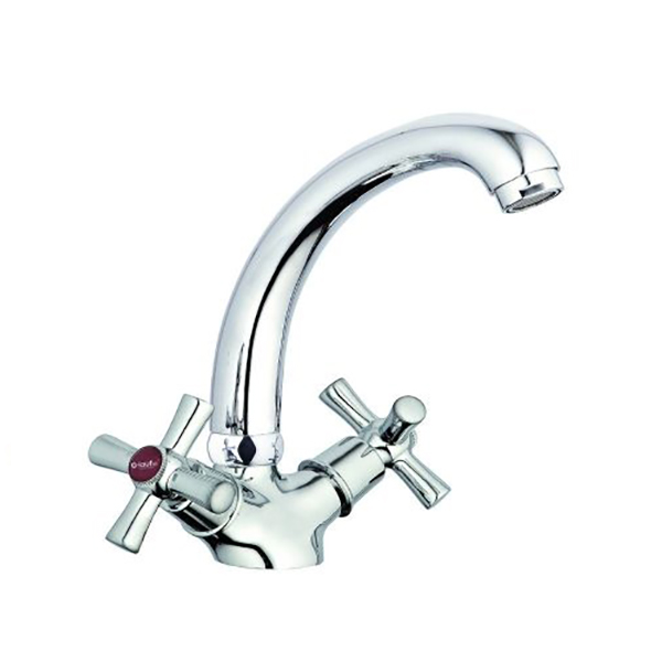Змішувач марки G-Lauf серії QMT4-С722 використовується для кухонної мийки, має вигнутий поворотний вилив (гусак) 135 мм, двовентильне управління. Конструкція сантехнічного приладу - 'ялинка'.